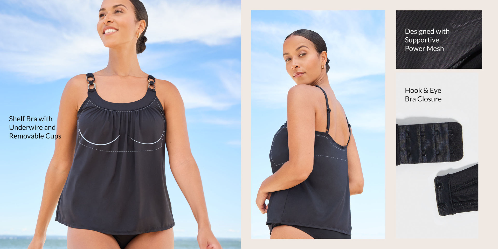 Hook back closures let you fine-tune your fit for the support you want. Bikinis have a slide and conceal cover for a seamless look.
