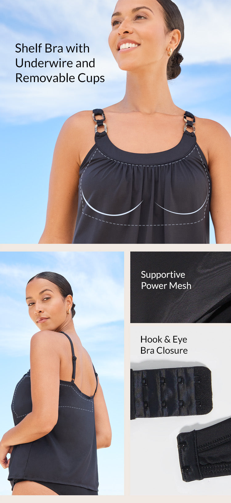 Engineered for exceptional support, the shelf bras combine a soft elastic bra band, contouring power mesh for shape and separation, and premium fabrics that are comfortable and durable over time.
