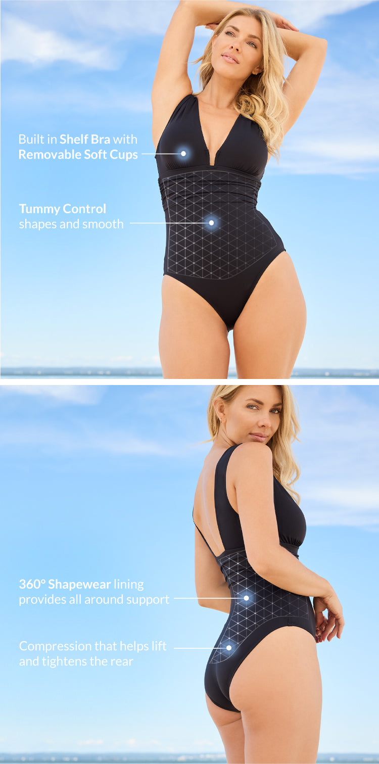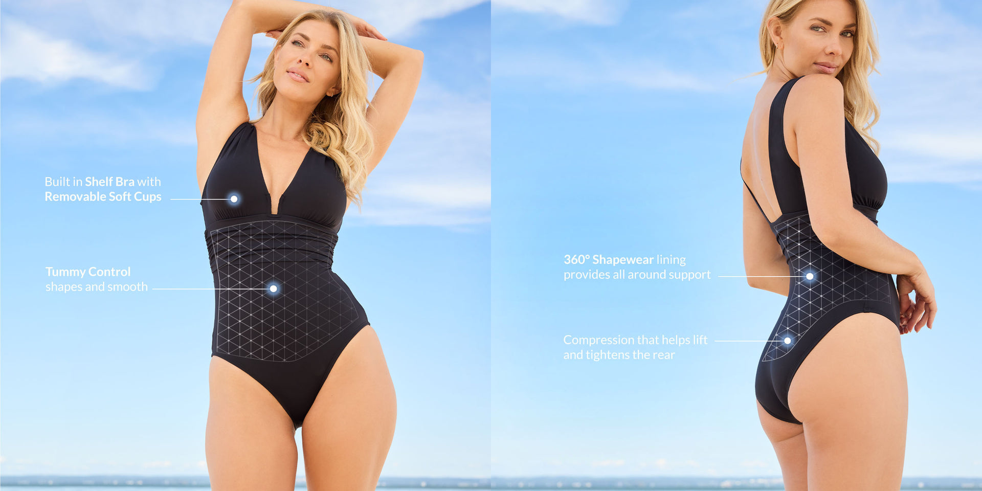 Dual layer construction combining soft exterior fabrics with compressive interior lining that sculpts and smooths. Swim in comfort and with confidence.