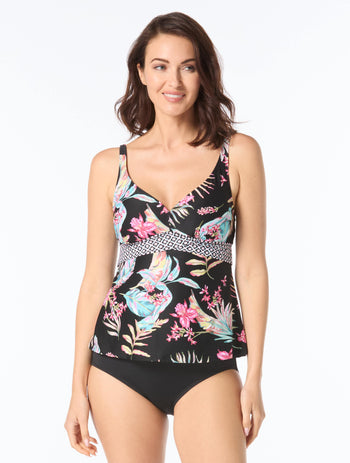 Hit the sand in style with a summer floral print tankini top. A fitted silhouette with v-neckline is a flattering style with comfortable coverage. Two prints in one are perfect for pairing with plenty of coordinating swim styles.