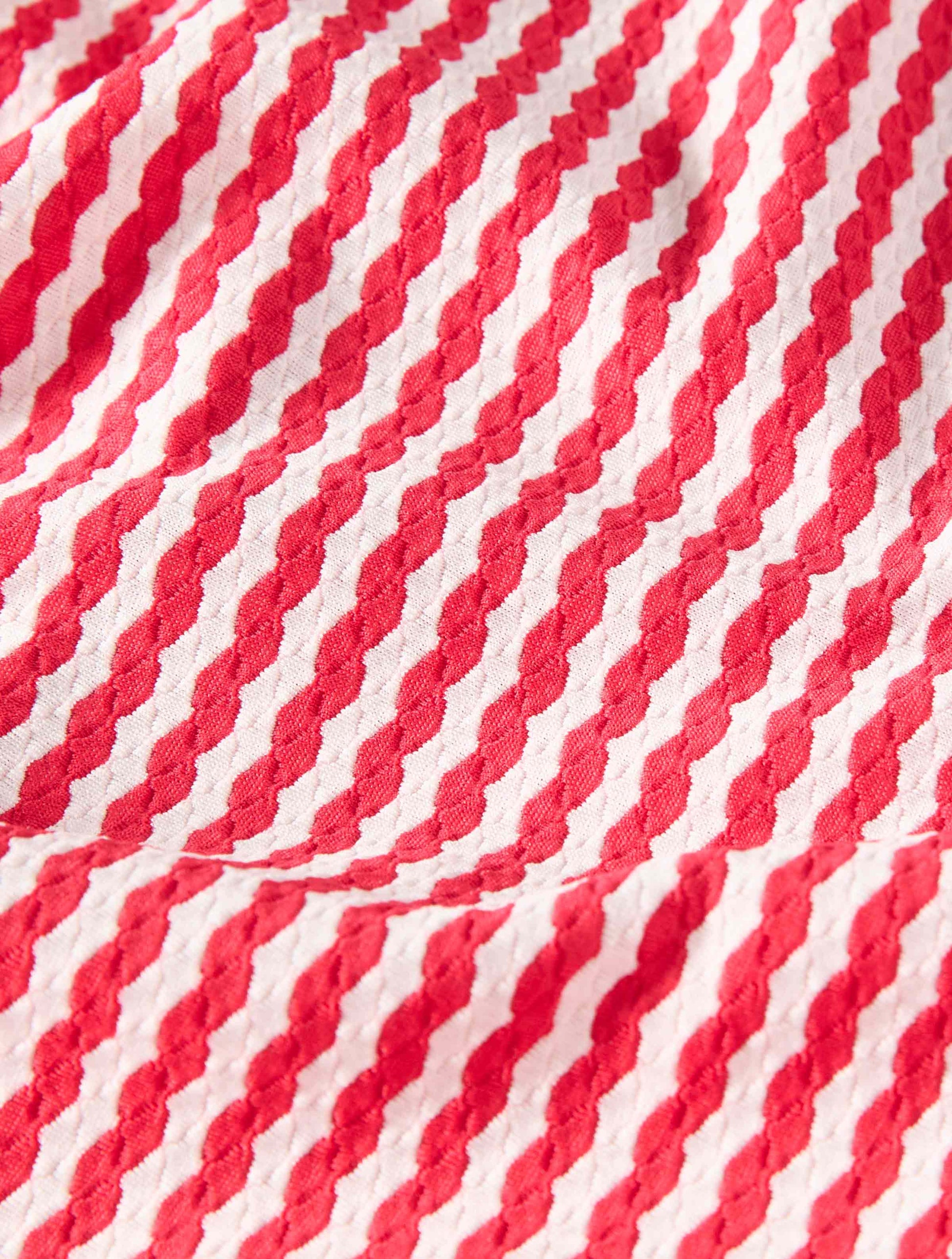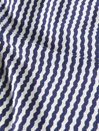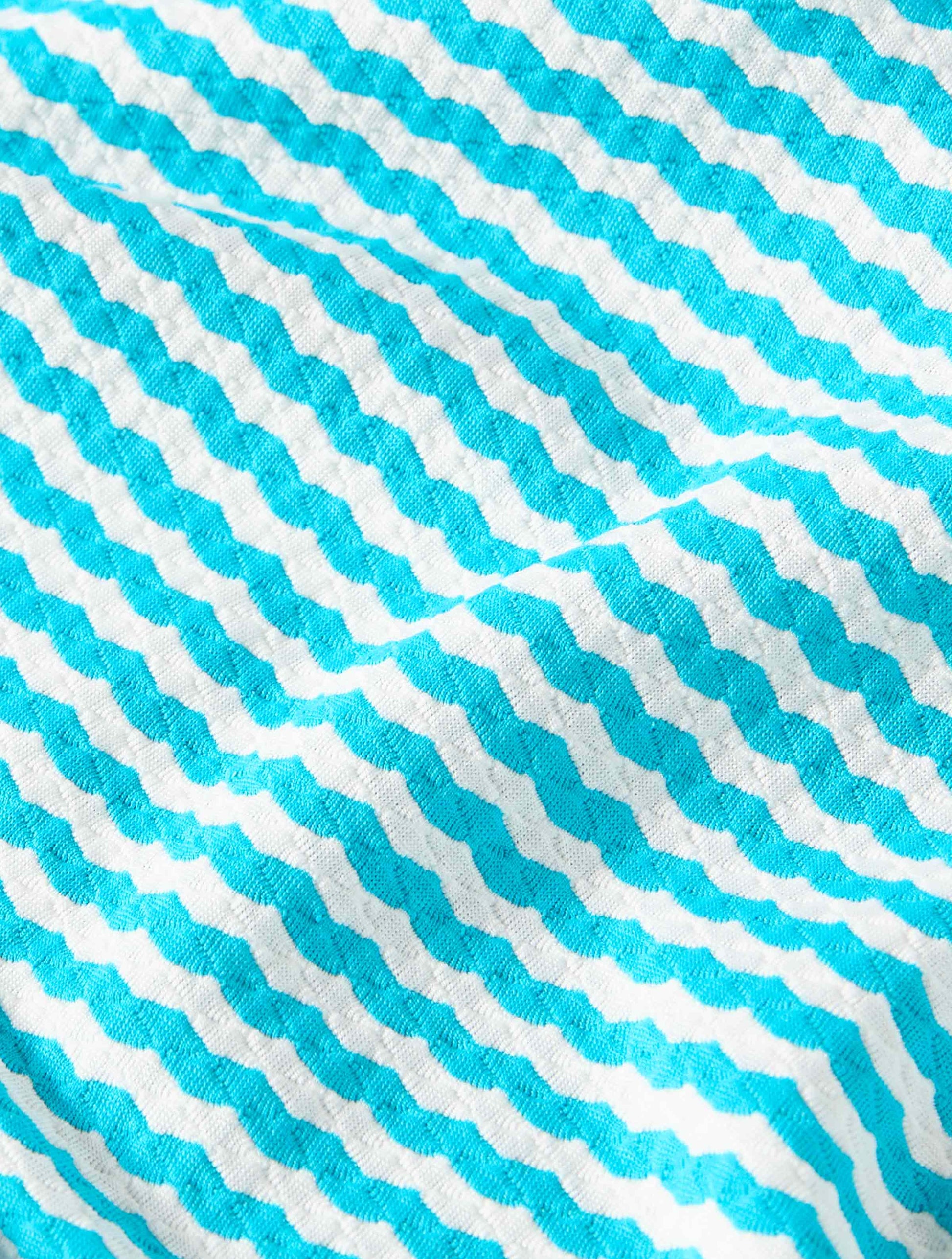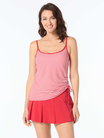 A simple and slimming tankini style in a classic stripe print inspired by yacht club style. A side drawstring creates a figure flattering asymmetrical silhouette. Soft, textured, honeycomb fabric elevates your swim style. Pair it with a bikini bottom, swim skirt or shorts.