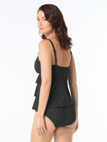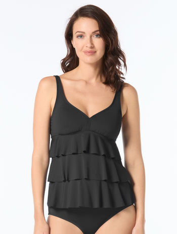 A flattering solid tankini top with layers of ruffles on the front that hide lines and cover your midsection. Pair it with an array of coordinating solid or printed swim bottoms.
