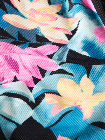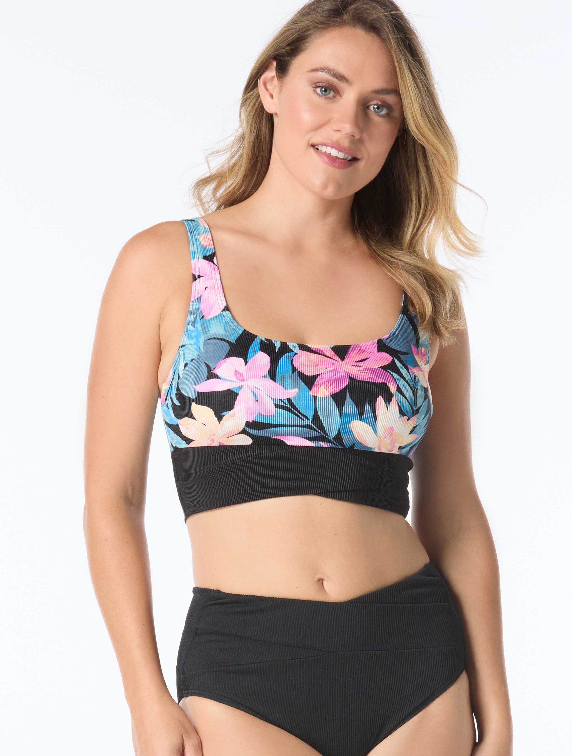 Be ready for a day at the beach, morning meditation or an afternoon surf session in this tropical print crop bikini top. This swim crop top is made to stand out and keep up with your active lifestyle. Ribbed fabric adds a stretchy, comfortable and textured touch.