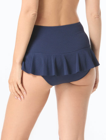 A solid bikini bottom that provides a little extra coverage in a feminine silhouette. Built in bottoms under the skirt allow for easy movement in and out of the water. Mix and match with coordinating soft, textured, honeycomb fabric tops for the perfect pairings.