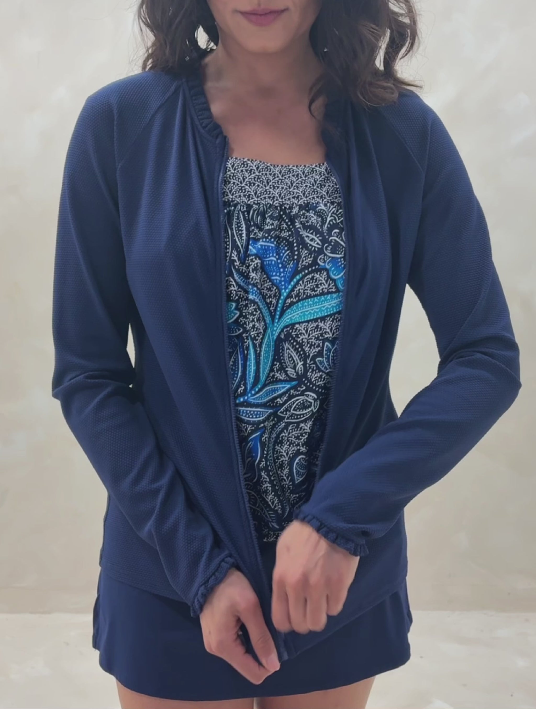 Stay stylish and extra protected from the sun with the Beach House Swim Phoebe Relaxed Fit Ruffled Rash Guard! Designed to be worn over your swim top, with a textured pique fabric and ruffle neckline, this sun guard will keep you fashionable while providing extra coverage from harmful rays. Beach House swimwear is designed with high-end fabrics that bend with you for extra comfort, easy fit and shape retention.