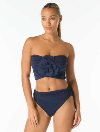 For the days you want a little more coverage than a bikini, this bandeau adds a little more length. A bold floral applique adds a statement to the neckline. Allover shirring flatters your figure. Pair this with a bikini bottom or wide leg pants for beach to brunch.