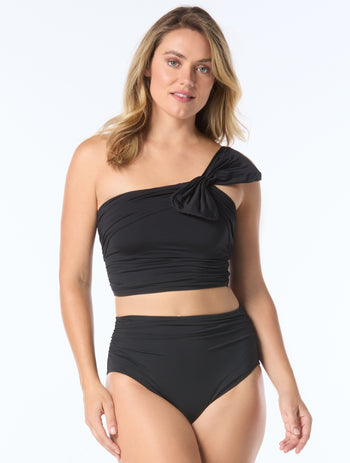 A classic crop top with a bow accent is the only crop top you'll need in your wardrobe! Carmen Marc Valvo One Shoulder Cropped Bikini Top features an accent bow detail on the shoulder with underwire so you'll be making a statement, while feeling supported,no matter where you are.