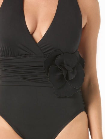 Carmen Marc Valvo Flower Applique Shirred Halter One Piece Swimsuit - Solids