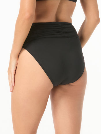 An ultra high waisted bikini bottom flatters your midsection with a shirred waistband. A high leg line elongates your legs. Solid colors make it perfect to mix and match with coordinating swim tops and cover ups for complete outfits and plenty of versatility.