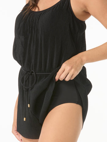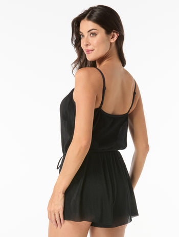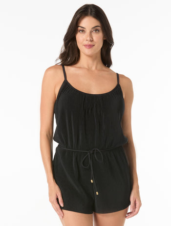 When you don't want to wear a dress and it's too hot for pants, this plisse romper gives you mobility and comfort. Allover plisse gives texture to this cool swim romper. With hidden swim bottoms, you can dive into the ocean or wear it on a oceanside stroll.