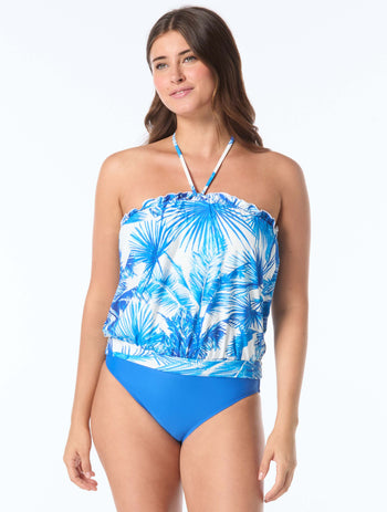 Get multiple looks in one with this multiwear bandini swim top in a palm tree print. Ruffled details add a feminine flair to the neckline. A blouson tankini top flatters your midsection. Pair it with a coordinating bottom and cover ups for a complete look.