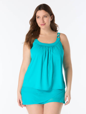 Stay ultra stylish in the Coco Reef Ultra Fit Bra Sized Underwire Tankini Top! This flattering tankini top features a fashionable touch with resin tortoise shell ring details on the straps paired with a classic scoop neck, removable soft cups, underwire and an a-line silhouette for shaping, stylish swimwear. The full-coverage tankini top in an array of bold solids is perfect for a tropical vacation, lounging poolside or a day at the beach.