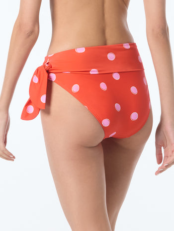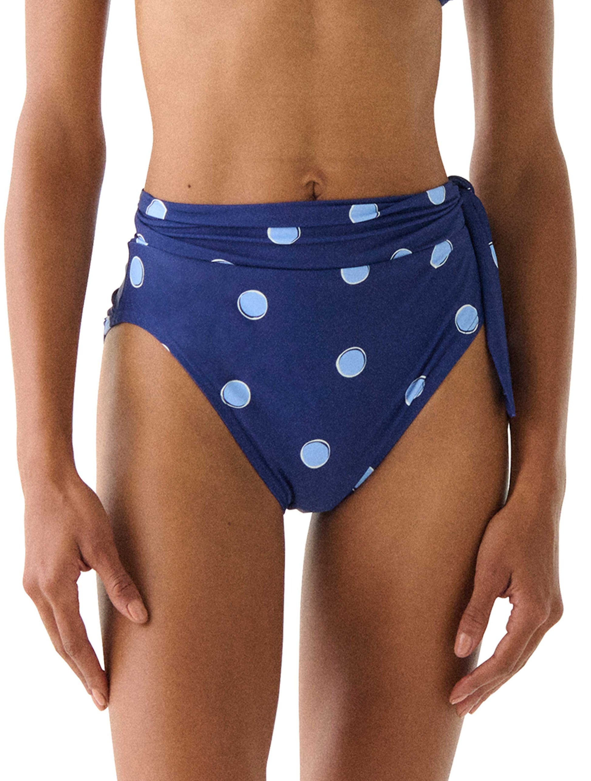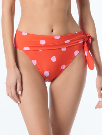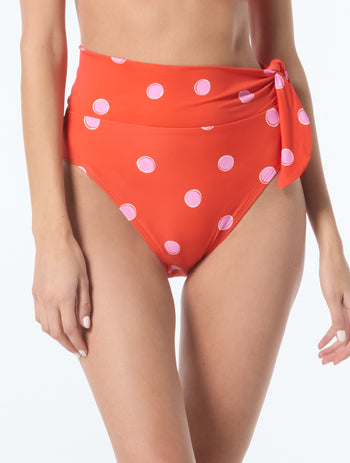 A retro inspired high waist bikini bottom in a colorful polka dot print. A side tie adds a fun detail to the waistline.