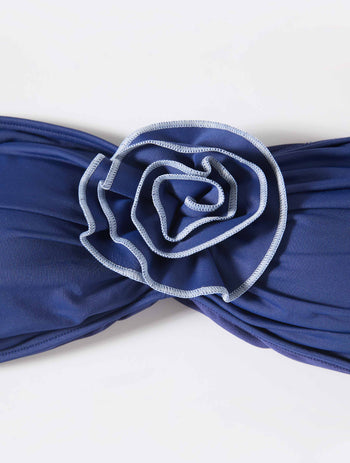 This solid bandeau one piece swimsuit with a contrast rosette detail at the front neckline is in full fashion bloom. A shirred front is ultra flattering while the adjustable neck strap offers support when you want it.