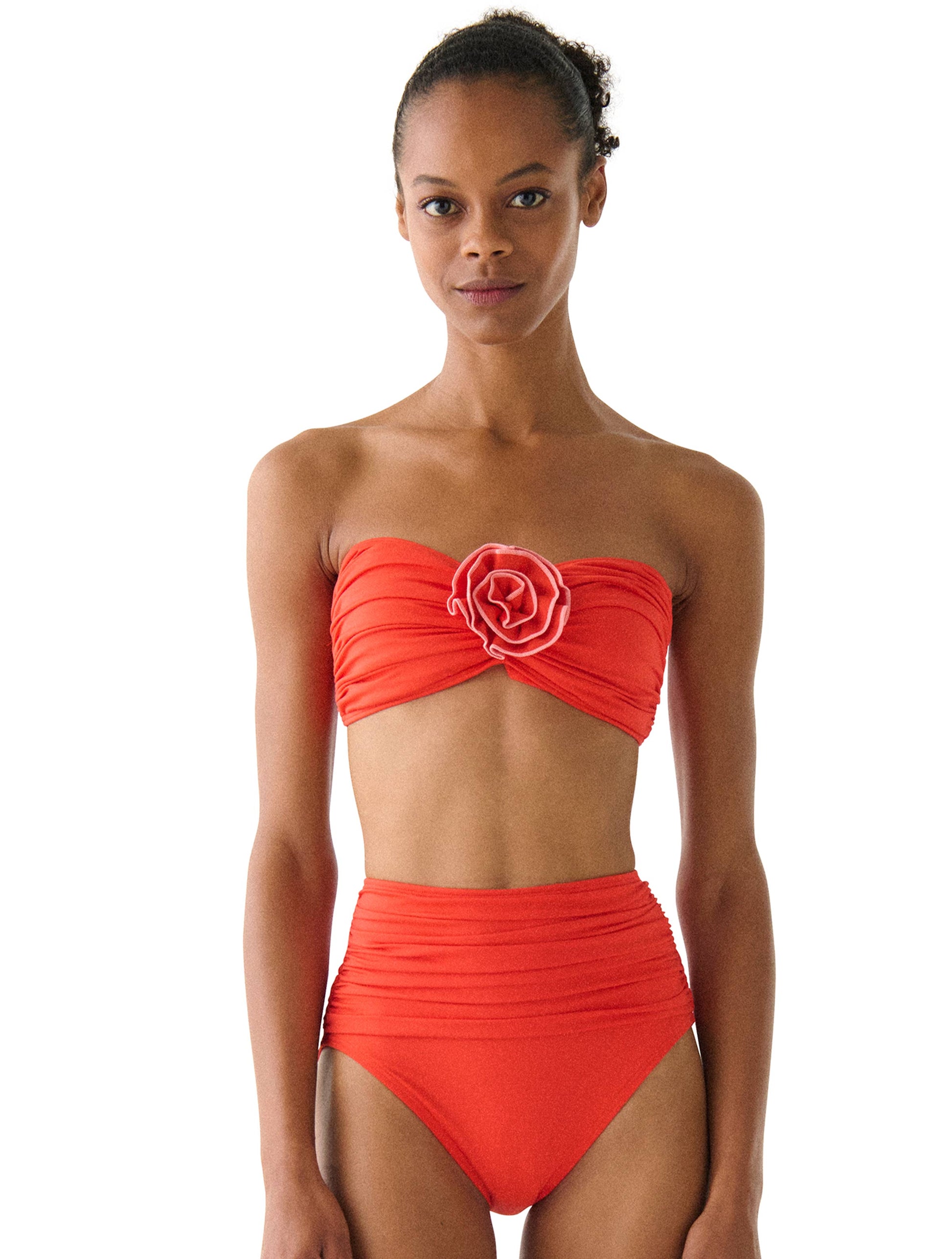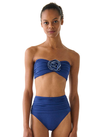 This bandeau bikini top is beautifully blooming with a rosette detail at the neckline for a chic and cheery swim top. Add the detachable strap for more support.