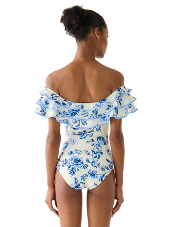 kate spade new york Off the Shoulder Ruffle One Piece Swimsuit - Floral Toile