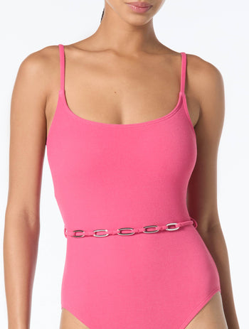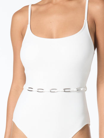 This textured one piece swimsuit provides chic coverage and all day comfort. An oval link chain belt adds a splash of luxury for an effortlessly cool look. Wear it to the beach or as a bodysuit with flowy pants for those cool summer nights.