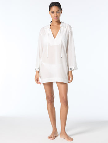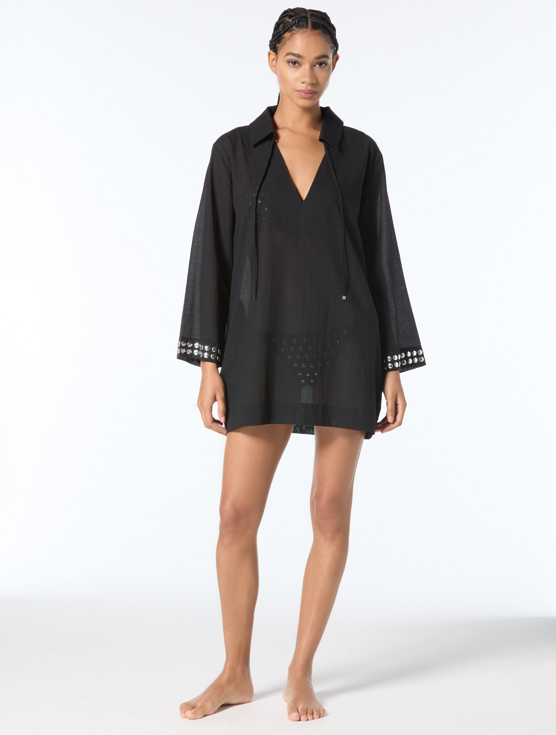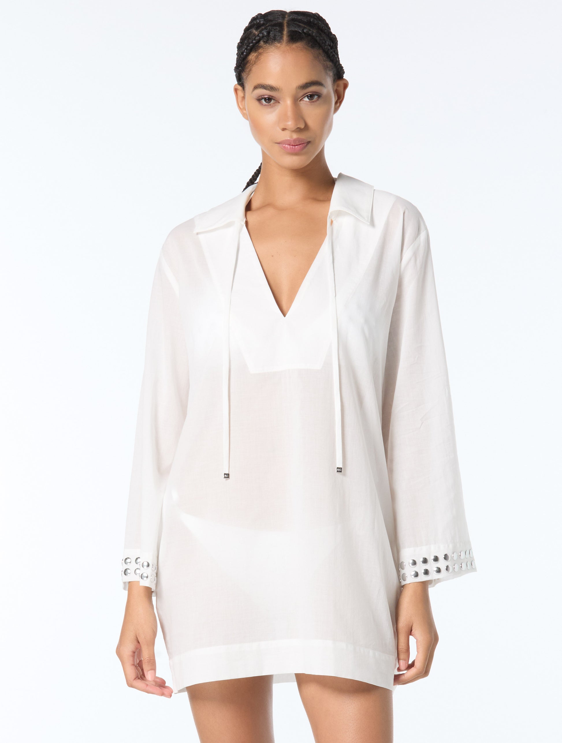 A long sleeve swim cover up that's lightweight and luxurious. Oversized studs on the sleeve hem add a splash of glam to your getaway look. Wear it over your swimsuit for the beach, boat or boardwalk.