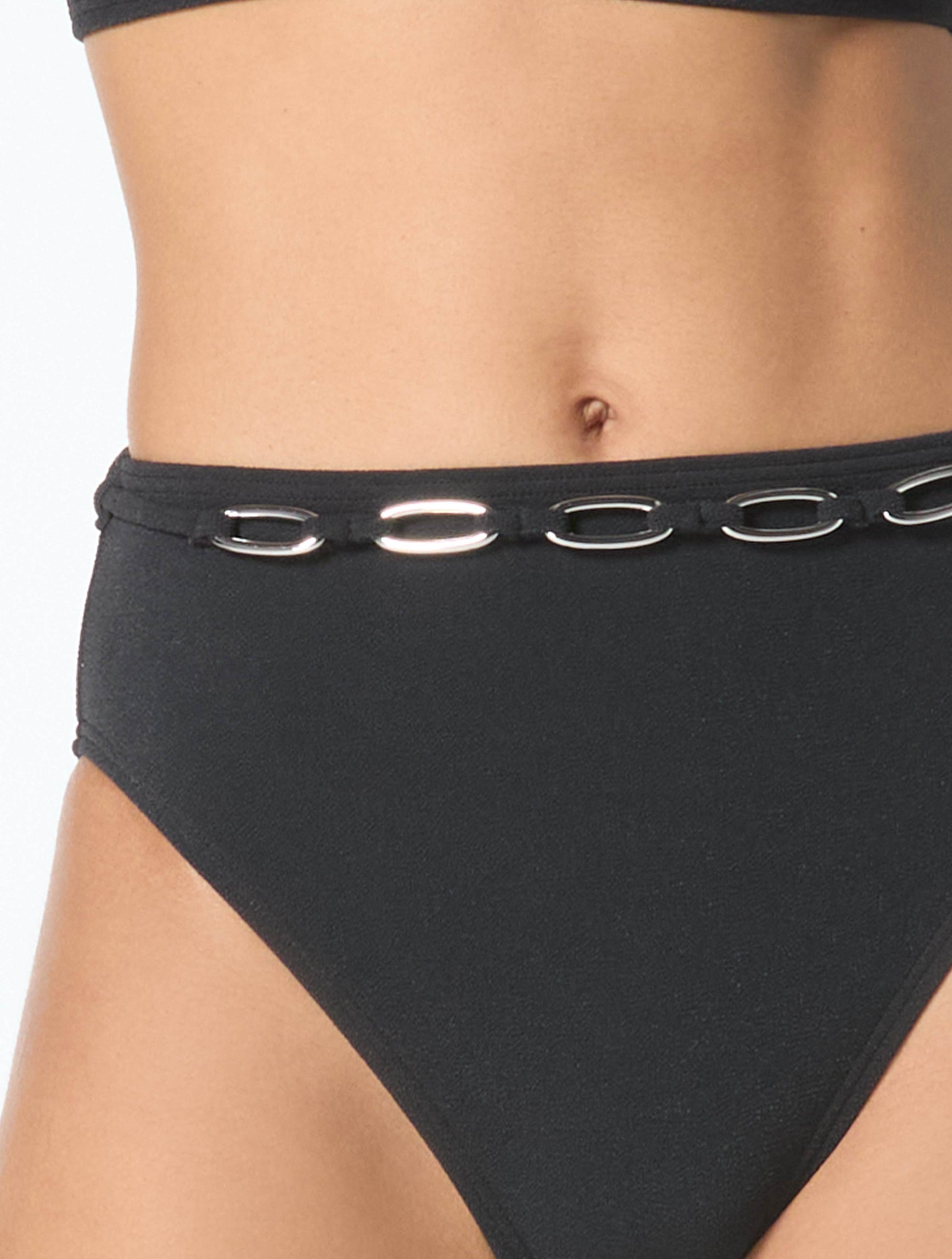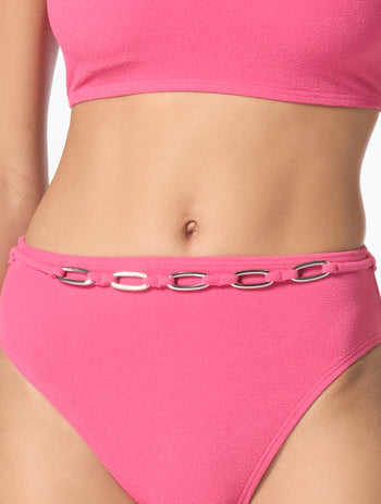 This textured high waist bikini bottom with high waistline provides chic coverage. An oval link chain belt adds a splash of luxury for an effortlessly cool look. Pair it with coordinating textured bikini tops for a complete outfit.