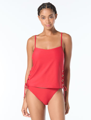 A simple style gets an eye catching statement with lace up grommets on the side in the MICHAEL Michael Kors Grommet Tankini Top. This flattering silhouette is perfect for poolside days to vacations in paradise.