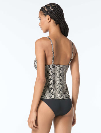 For an exotic beach look this snakeskin tankini top provides chic coverage. Logo chain straps add a splash of luxury for an effortlessly cool look. Pair it with a coordinating python print bikini bottom, skirt or denim shorts for all your vacation looks with one versatile tankini top.