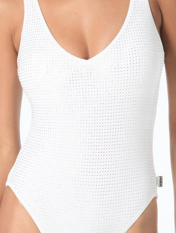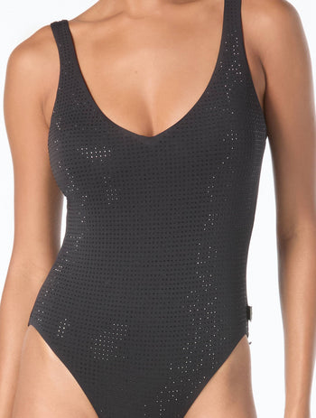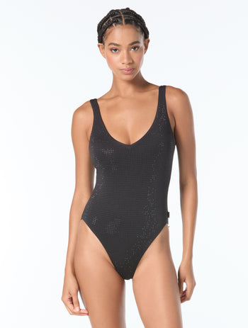 An effortlessly bold, rhinestone one piece swimsuit. Timeless solids get a splash of glitz and glam with an allover rhinestone front. A V-Neck and low back show  just the right amount of skin and provide a flattering fit.