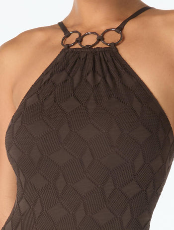 Go chic in the Vince Camuto High Neck One Piece Swimsuit! A soft crochet in a geo pattern in chic solid colorways is accentuated with a fashionable neckline featuring gold, bamboo inspired ring trim, for a not so basic one piece.