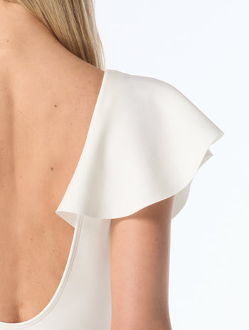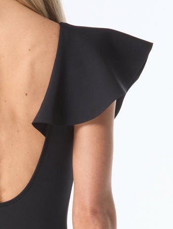 A cool one-piece swimsuit with a statement ruffle strap for an asymmetrical style. Crafted from sculpting scuba fabric, it smooths and embraces your curves for a flawless fit.