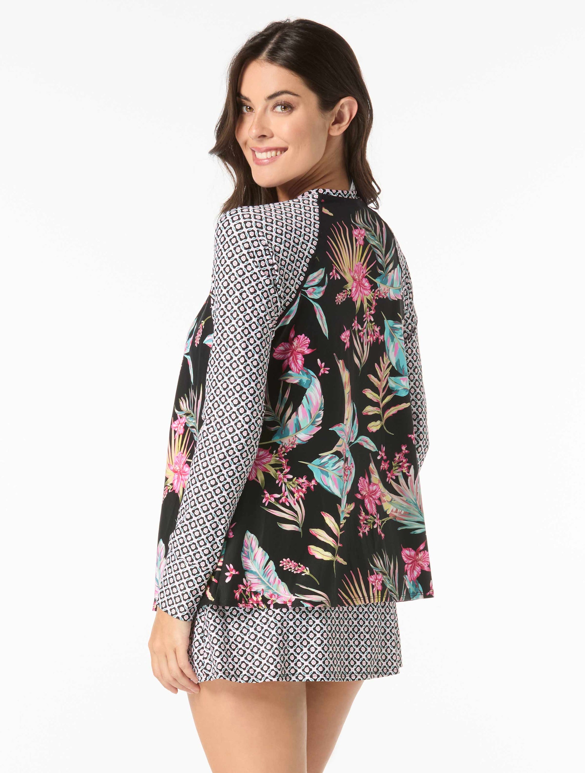 A slimming and sporty look in a summer floral print tankini top with racerback. A zipper front allows you to show more or less neckline. Pair it with a bikini bottom, swim skirt or shorts. Two prints in one are perfect for pairing with plenty of coordinating swim styles.