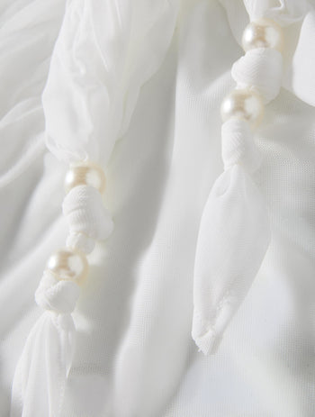 For an every day beach essential, this short pareo is perfect to throw over any swimsuit. Mesh fabric is lightweight and breathable. Pearl bead trim on the side ties offer a touch of luxe. Mix and match with solid or printed swimsuits.