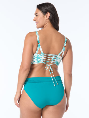 A wow factor without compromising support in this tropical print bikini top. Bra sized cups are separated by a no dig, plunging, v-wire neckline and lace up back. Pair it with coordinating printed or solid swim bottoms.