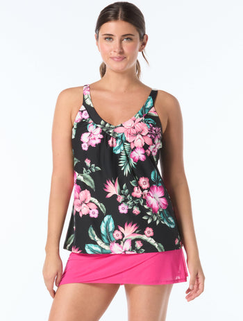 Chic style and feminine coverage come together in this tankini top in a romantic floral print. Pair it with a coordinating swim bottom or throw on a pair of denim shorts for a beach and beyond style.