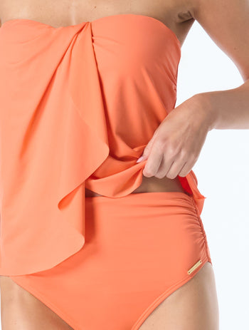 Wear strapless or as a halter, the Vince Camuto Draped Bandeau Tankini Top is draped at the front with a breezy, split flyaway ruffle.