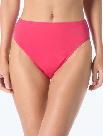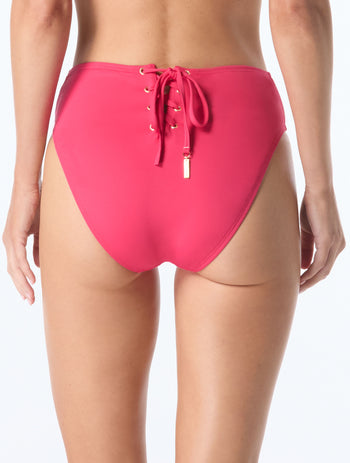For a little more coverage on your waist, this high waist bikini bottom is extra flattering. A laced up back adds a statement to the backside of this solid high waist swim bottom.