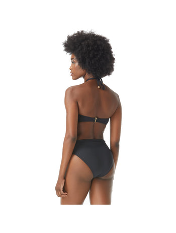 The Vince Camuto Logo Ring Cut Out Halter Bikini Top takes a classic halter top and adds a bold neckline with a ring cut out, logo cord ends and removable soft cups.